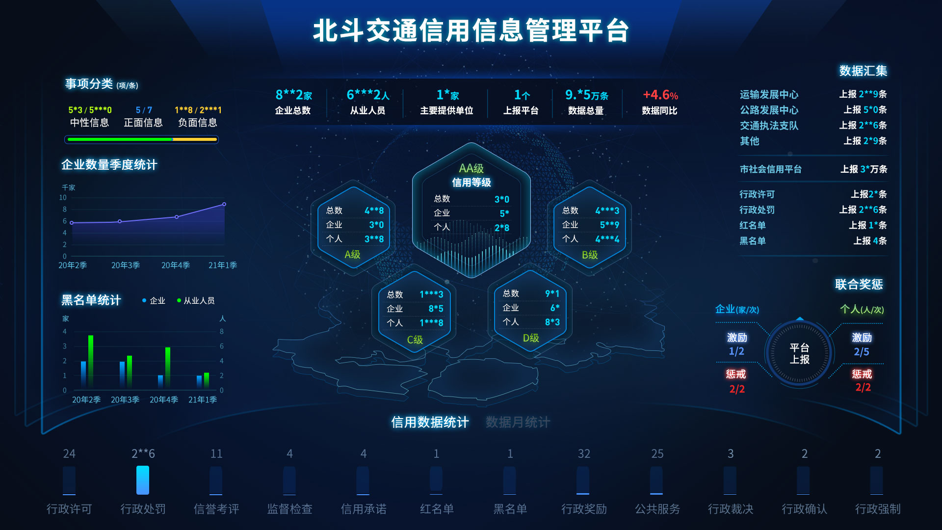 該系統(tǒng)是福建省首個城市級交通信用系統(tǒng),獲得多項軟件著作權,入選廈門市2020社會治理智能化應用“創(chuàng)新應用項目”。平臺集征信、評價、用信、服務、共享為一體,打通城市交通運輸系統(tǒng)內(nèi)外部信用數(shù)據(jù)對接渠道;匯聚運輸企業(yè)、從業(yè)人員、行政處罰、行政許可、紅黑灰名單等數(shù)據(jù)信息,實時推送至城市信用平臺進行公示;對接聯(lián)合獎懲名單數(shù)據(jù),加強紅黑灰名單共享,強化聯(lián)合獎懲力度。