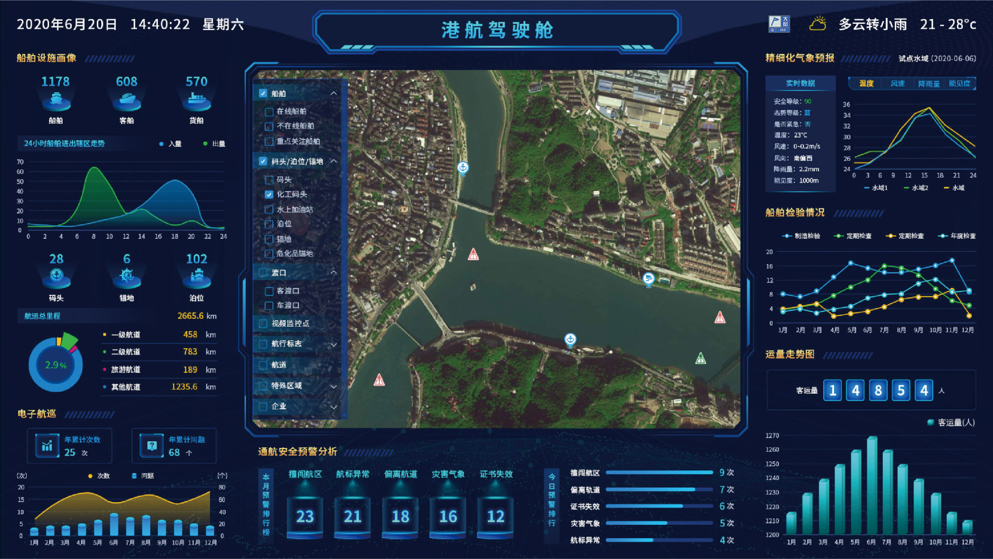 港航駕駛艙以數(shù)據(jù)匯聚和整合為基礎(chǔ),深度融合地理信息矢量數(shù)據(jù)、電子海圖等主要資源圖層,依次疊加航標(biāo)、泊位、錨地、監(jiān)控點等位置數(shù) 據(jù),航運、經(jīng)營、安全、航線、規(guī)劃建設(shè)等專題數(shù)據(jù),以及AIS船載終端、定位終端、移動設(shè)備、視頻監(jiān)控等動態(tài)數(shù)據(jù),對接各業(yè)務(wù)系統(tǒng),多維動態(tài) 展示港航信息化建設(shè)、基礎(chǔ)設(shè)施布局和應(yīng)急物資布局成果,實現(xiàn)“一張圖”管理、指揮和調(diào)度。