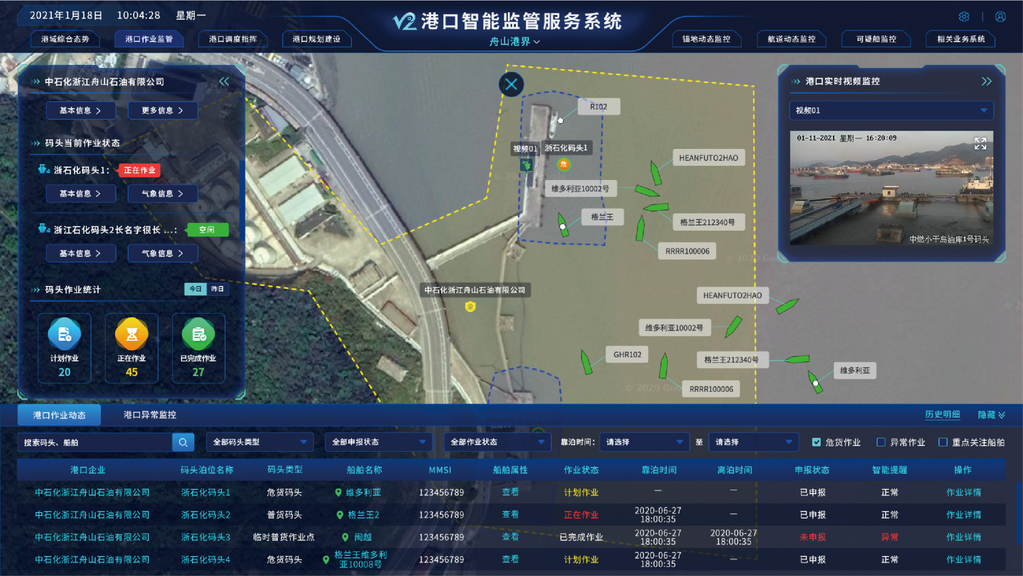 對港口企業(yè)、碼頭泊位的作業(yè)情況進行可視化智能監(jiān)控,識別碼頭船舶靠離泊事件,自動調(diào)取港口視頻監(jiān)控進行靠離泊抓拍。同時關(guān)聯(lián)港口作業(yè)申報、視頻、雷達等數(shù)據(jù),識別未申報靠泊、靠泊泊位不匹配、超噸位靠泊等異常事件,實現(xiàn)碼頭作業(yè)的自動化監(jiān)管。