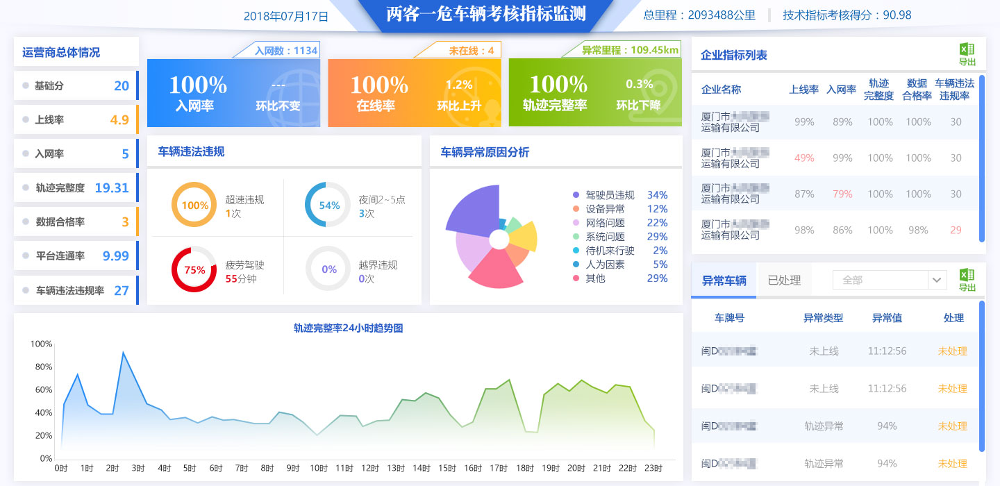 2019年11月,我司在福建省廈門市建設了廈門市重點營運車輛行業(yè)監(jiān)測處置系統(tǒng),該項目采用統(tǒng)一的車載終端標準和動態(tài)監(jiān)管平臺,采集全市重點營運運輸車輛數(shù)據(jù),將運輸企業(yè)基礎數(shù)據(jù)和車輛行駛等動態(tài)數(shù)據(jù)納入監(jiān)管系統(tǒng)并進行綜合處理分析,并接入車載主動安全報警數(shù)據(jù),實現(xiàn)全流程閉環(huán)管理。同時,系統(tǒng)引用省廳考核機制,將共享車輛違規(guī)數(shù)據(jù)反饋給企業(yè)及運營商,以此建立企業(yè)和運營商同步指標考核機制,促進監(jiān)管與服務同步發(fā)展,將單一的管控平臺轉化為監(jiān)管與服務一體化的全方位平臺。